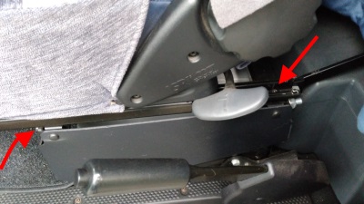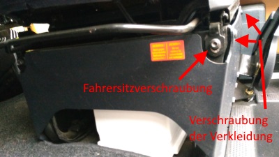 Der Ausbau des Sitzes war recht simpel: Der Sitz ist mit vier Torx-Schrauben (TX 40) befestigt. Zwei Schrauben sind vorne am Sitz, zwei hinten innenliegend auf der Schiene. Ich habe erst die Schrauben vorne gelöst, dann den Sitz nach vorne geschoben um die hinteren Schrauben zu lösen. Schon ist der Sitz herauszunehmen. Man muss nur aufpassen, wenn die Handbremse angezogen ist. Dann nämlich ist der Handbremshebel etwas im Weg ;-) Wenn der Sitz aus dem Fahrzeug genommen ist, muss man noch die Seitenverkleidung lösen.