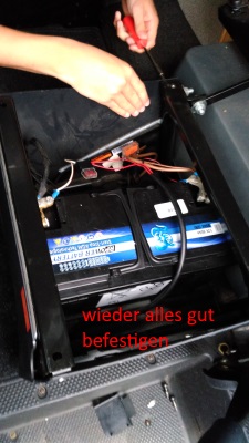 Das waren bei mir wiederum vier diesmal kleine Kreuzschlitzschrauben. Die Verkleidung auch beiseite legen und man hat freien Zugang zur Batterie. Erst (-)-Pol lösen, dann (+)-Pol. Nicht vergessen, die Batteriearretierung zu lösen, sodann kann man die Batterie vorsichtig (wegen der Verkabelung) nach vorne unter dem Sitz (in Richtung Pedale) herausschieben. Den ganzen Vorgang anders herum und schon ist man fertig.